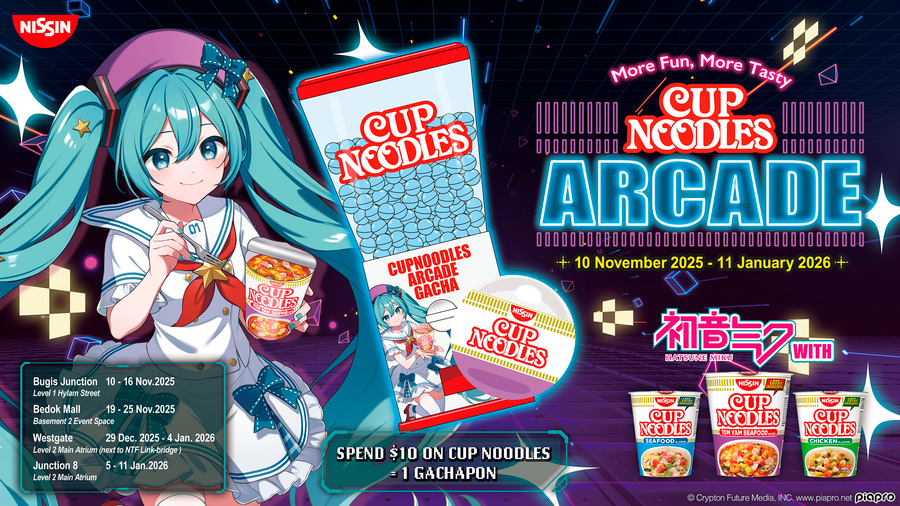 NISSIN FOODS SINGAPORE Presents Cup Noodles x Hatsune Miku Limited-Edition Arcade Pop-Up Event, Running from November 2025 to January 2026.
